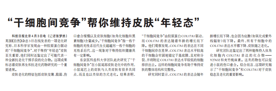 科技日報(bào)北京4月3日電(記者張夢然)英國《自然》雜志3日在線發(fā)表的一項(xiàng)老化研究稱,日本科學(xué)家發(fā)現(xiàn)由一種膠原蛋白驅(qū)動的“干細(xì)胞…